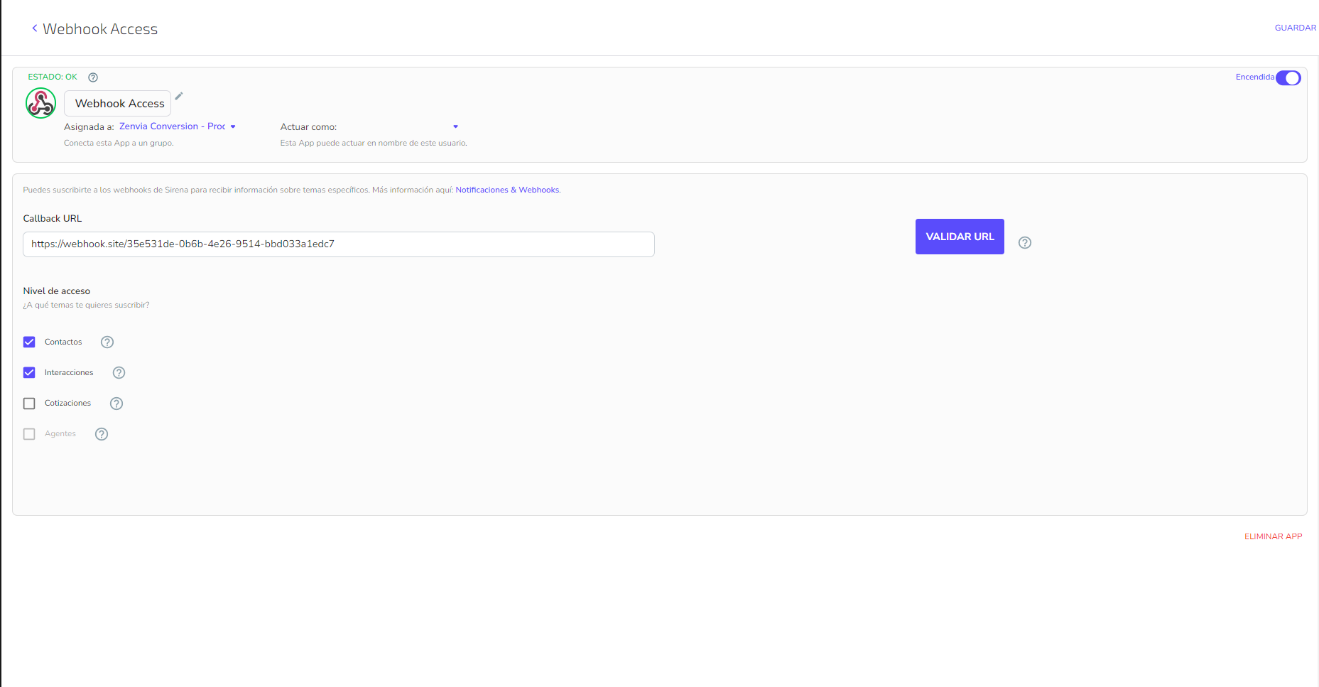 Accede a la sección Integraciones, busca WebHooks Access y configura la aplicación:
