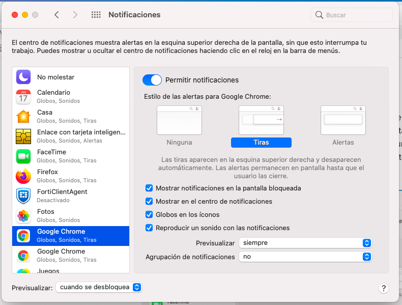 Para Mac OS, ve a Preferencias del sistema > Notificaciones y desde ahí asegúrate de permitir notificaciones de tu navegador. Toma en cuenta que las notificaciones se verán según el estilo que elijas, nosotros sugerimos que en Agrupación de notificaciones elijas No: