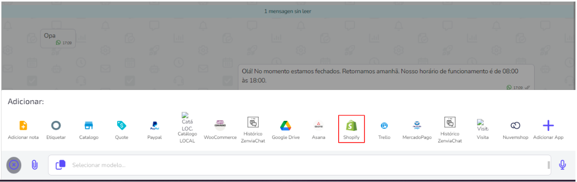 2- Cliquea en el ícono de Shopify. Se te abrirá una pantalla en dónde podrás colocar el SKU del producto. Aparecerá una vista previa del mensaje que enviarás.