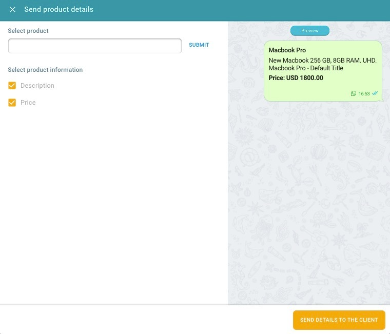 3- Puedes elegir si quieres o no agregar el precio y la descripción. Presiona el botón de enviar para que tu cliente reciba el mensaje en su WhatsApp.