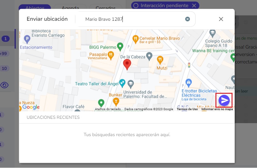 Presiona el ícono del avión de papel ubicado a un costado para enviar la ubicación a tu contacto, de esa forma, te encontrará fácilmente. En Ubicaciones recientes tendrás acceso a las direcciones que más utilizas.
