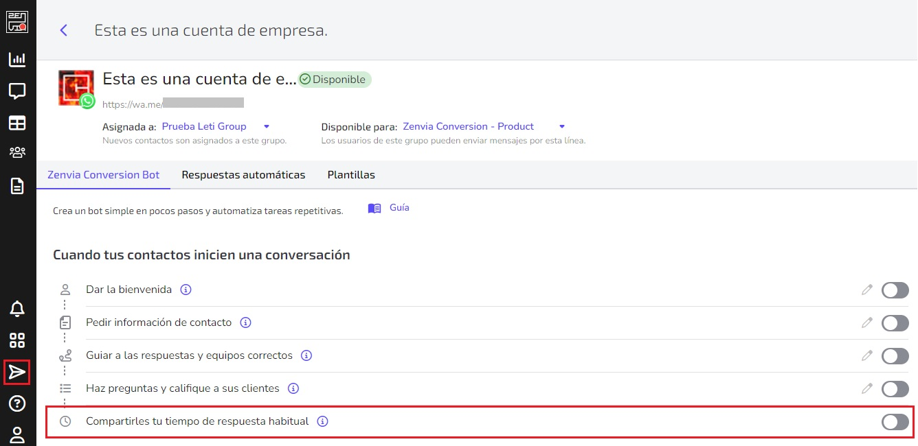 Nota: El tiempo de respuesta está determinado por la mediana de los tiempos de respuesta en los últimos 7 días. Si se iniciaron menos de 5 conversaciones en los últimos 7 días, se utiliza el último tiempo de respuesta conocido.