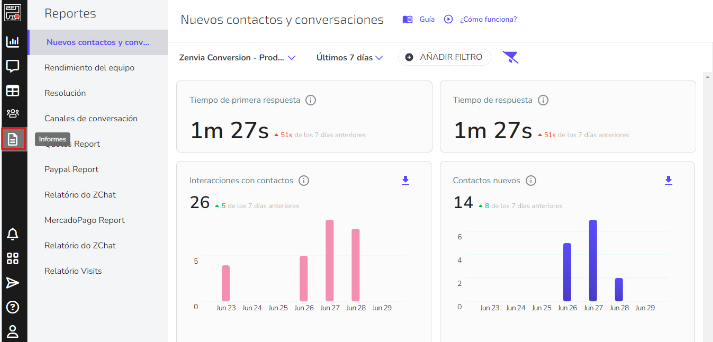 Informes: un usuario con función de administrador puede crear reportes personalizados a los que se puede acceder desde la sección Informes en Zenvia Conversion.