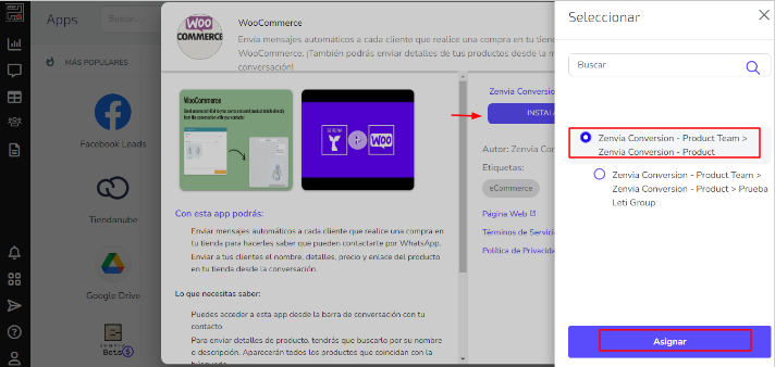 3 - Luego, debes elegir el grupo donde instalar la app, para eso, presiona el botón indicado > selecciona el grupo que deseas > haz clic en Asignar > Instalar: