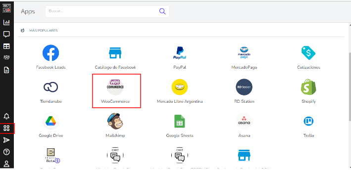 1 - Ve a Integraciones y haz clic en el ícono de WooCommerce: