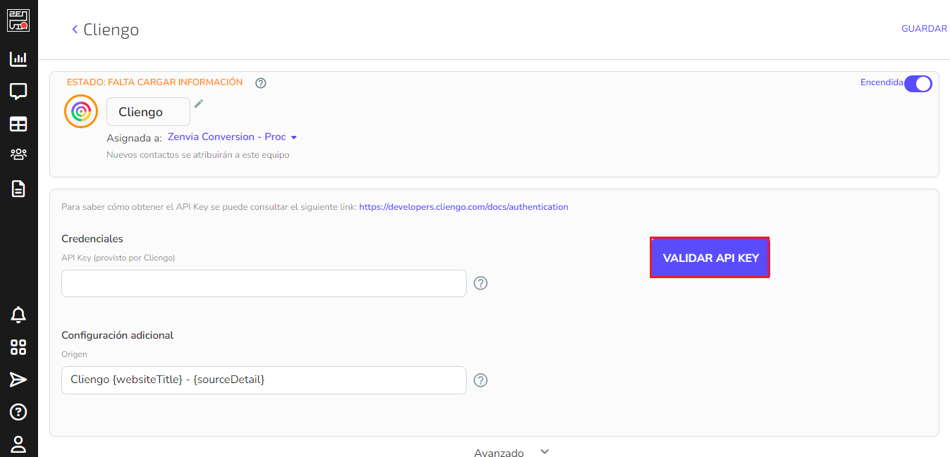 Una vez que la obtienes, dirígete a Integraciones y haz clic en Cliengo y colócala en el el sector correspondiente. Presiona VALIDAR API KEY.