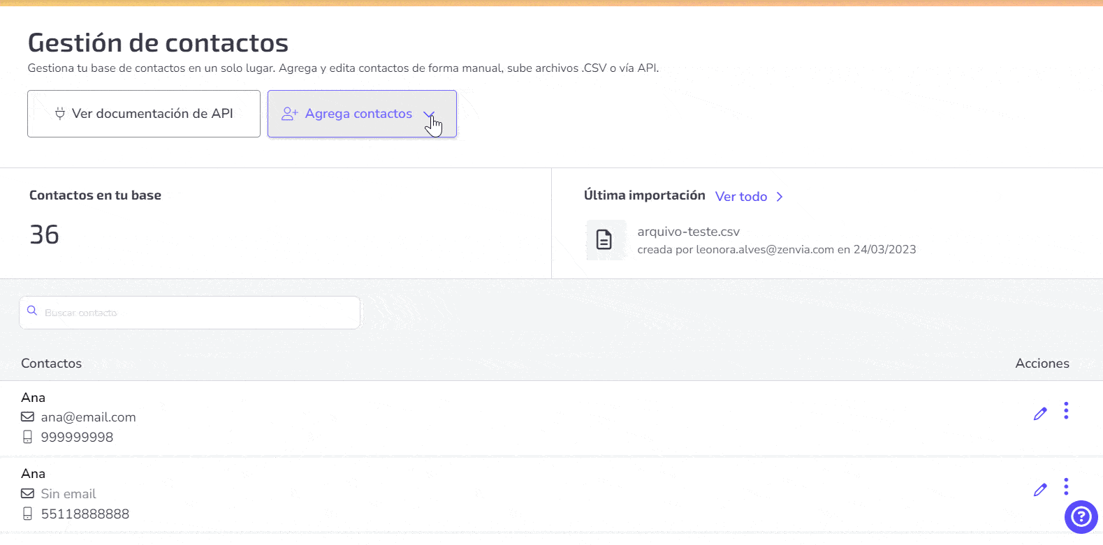Hay dos formas distintas de añadir contactos en Zenvia Attraction: mediante la importación de archivos o manualmente.
