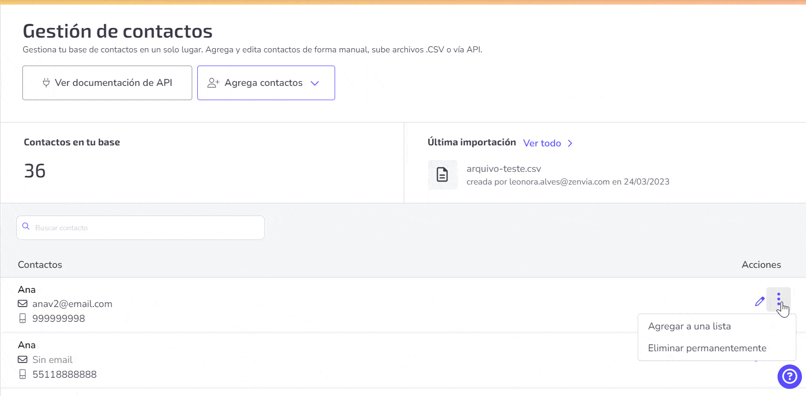 Gestionar contactos en Zenvia Attraction