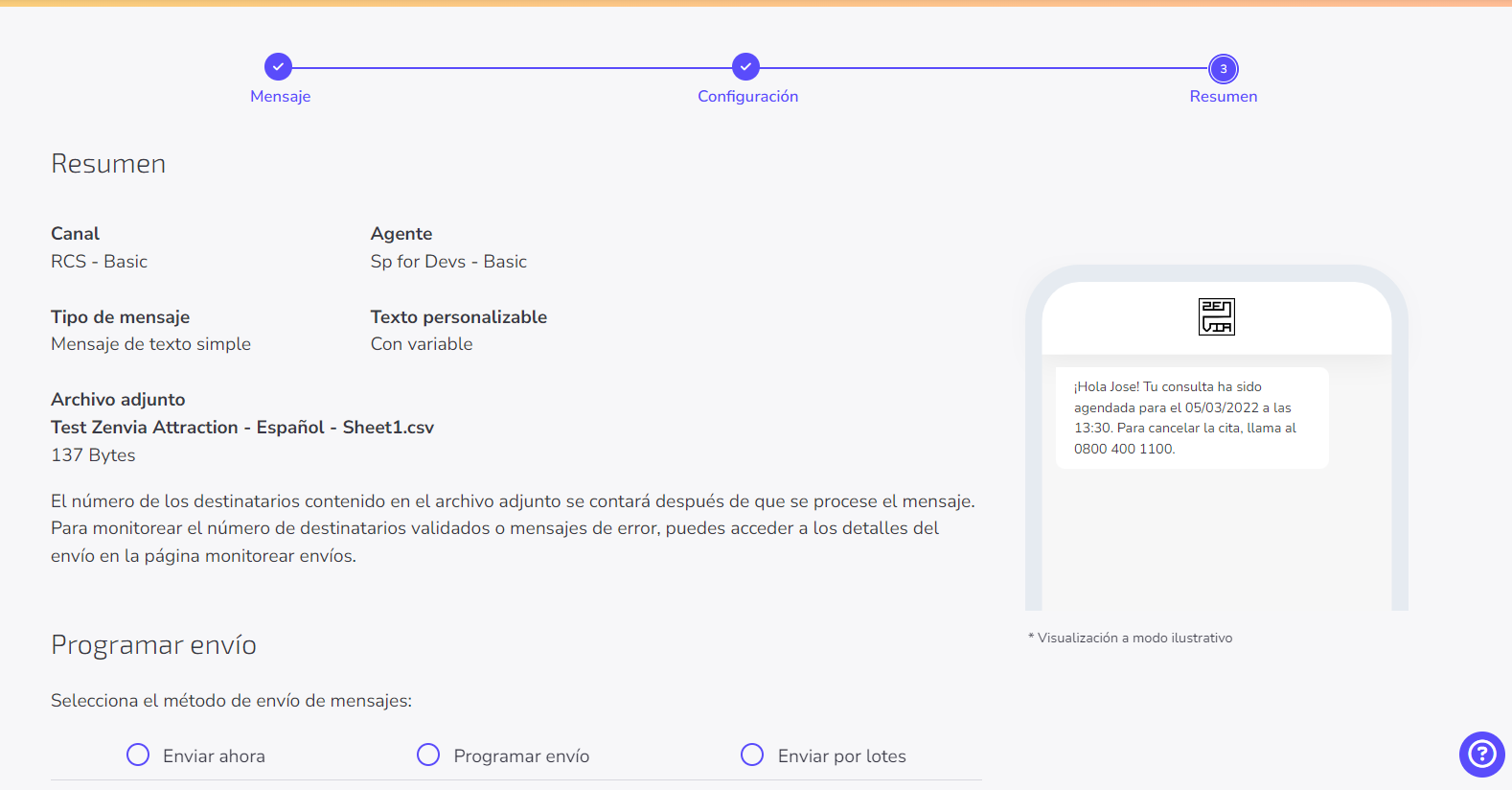 Después de completar la etapa de destinatarios, se mostrará un resumen del envío, con tres tipos de programación de mensajes: