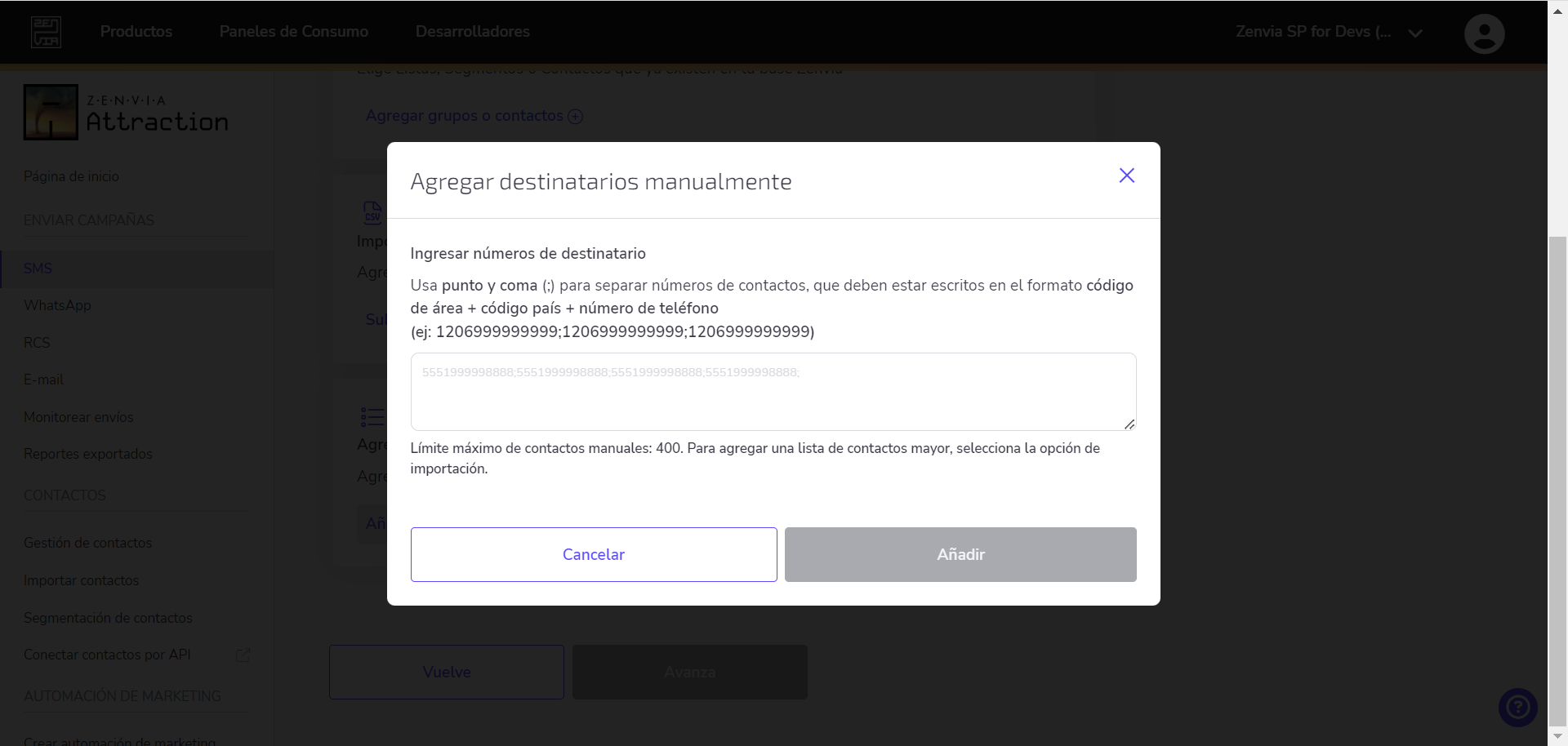 Al seleccionar la opción Agregar contactos manualmente, debes agregar los números de destinatarios utilizando punto y coma (;) para separar los números de los contactos, los cuales deben estar en formato DDI + DDD + 9 dígitos.
