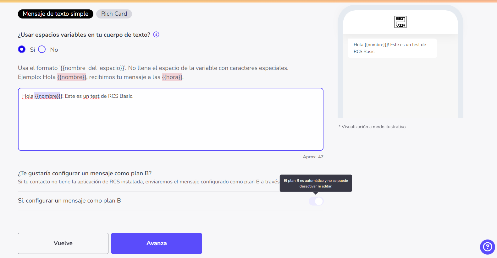 ⚠️ Atención: Ten en cuenta que la opción para configurar un mensaje como plan B aparece deshabilitada para envíos de mensajes en la versión básica de RCS.