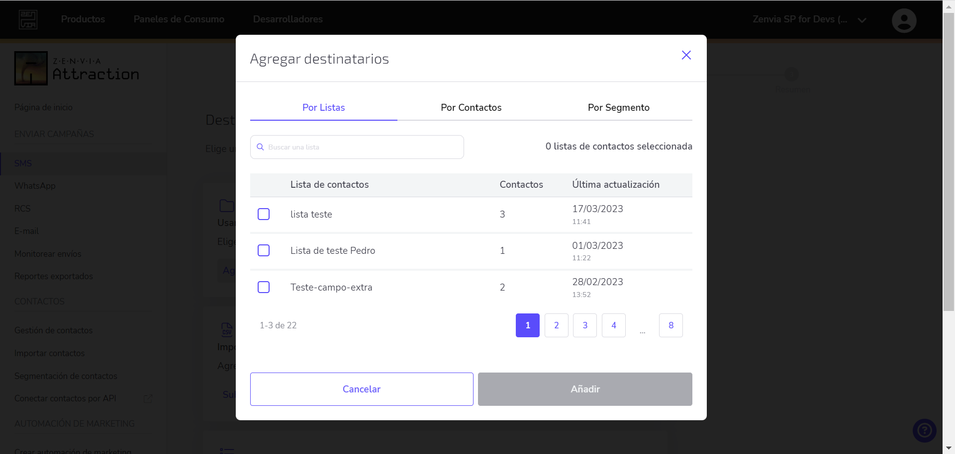 Al seleccionar la opción Usar base de contactos, debes seleccionar la lista de contactos, contactos específicos o reglas de segmentación que ya hayas agregado en la plataforma para recibir este envío. Al finalizar, haz clic en Añadir.