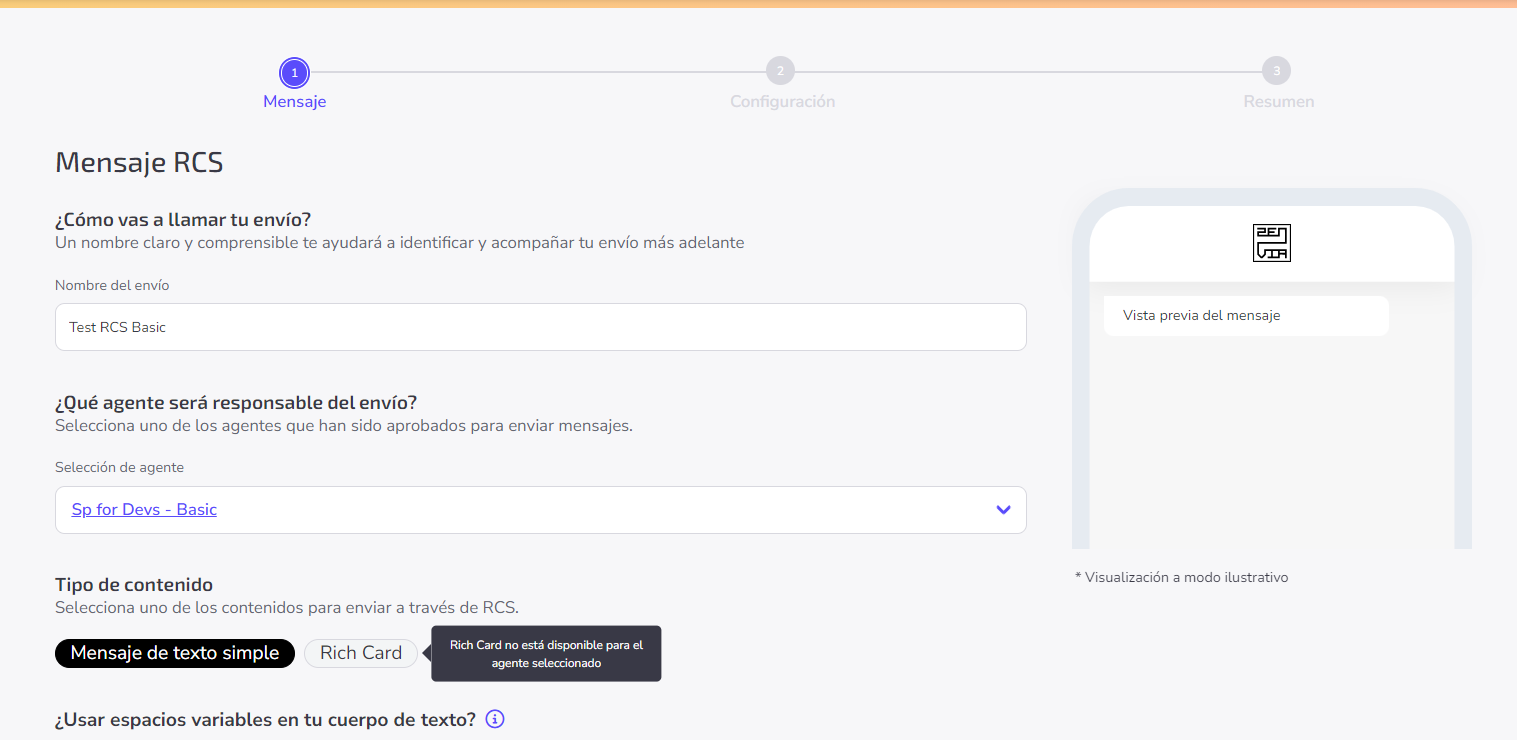 4. A diferencia de Rich Card, en RCS Básico, el mensaje de respaldo ("fallback") es automático. Esto significa que si el dispositivo del destinatario no admite RCS, el mensaje se enviará automáticamente como SMS.