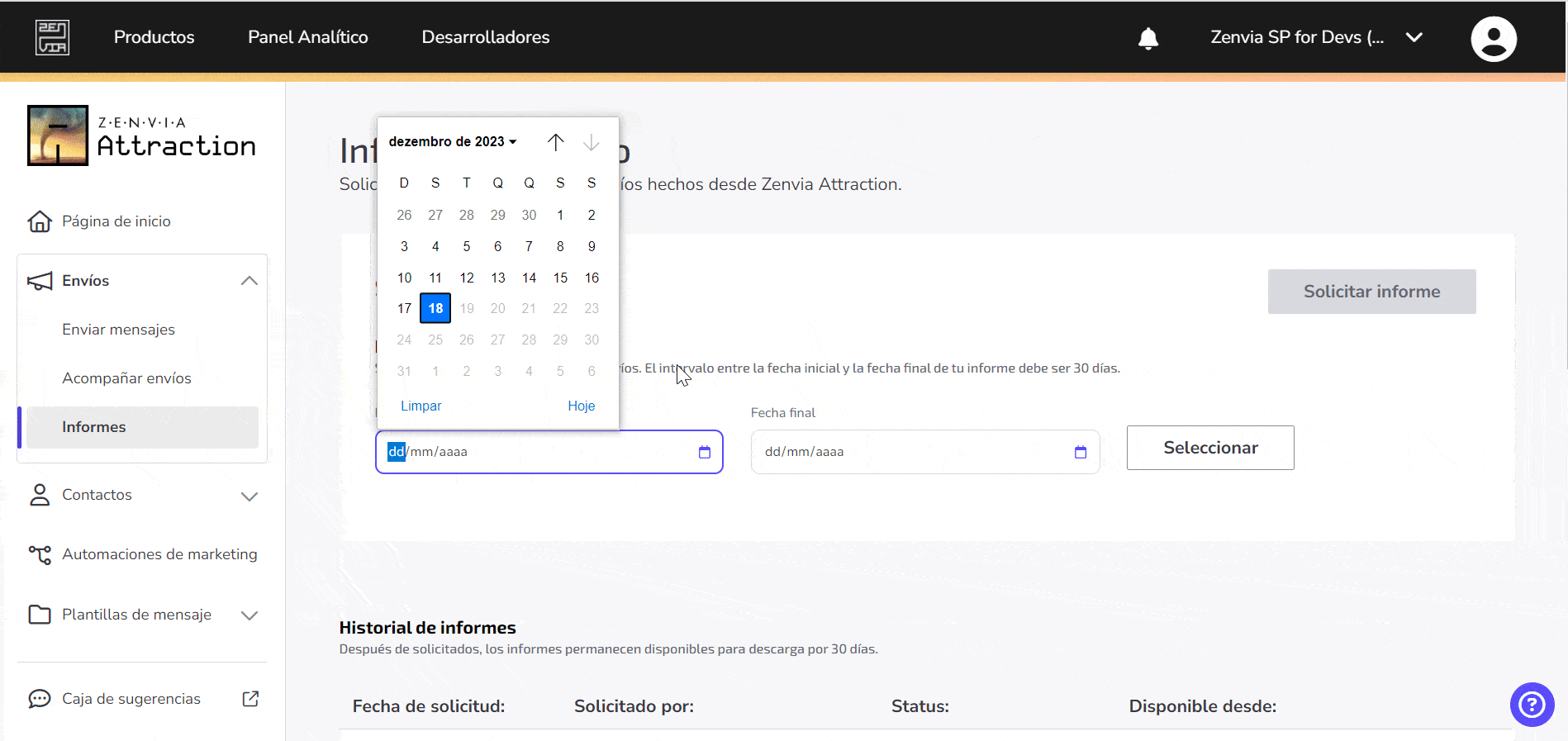 💡 Tip: El nombre del informe sigue el formato DD/MM/AAAA + Zenvia Attraction informes exportados.