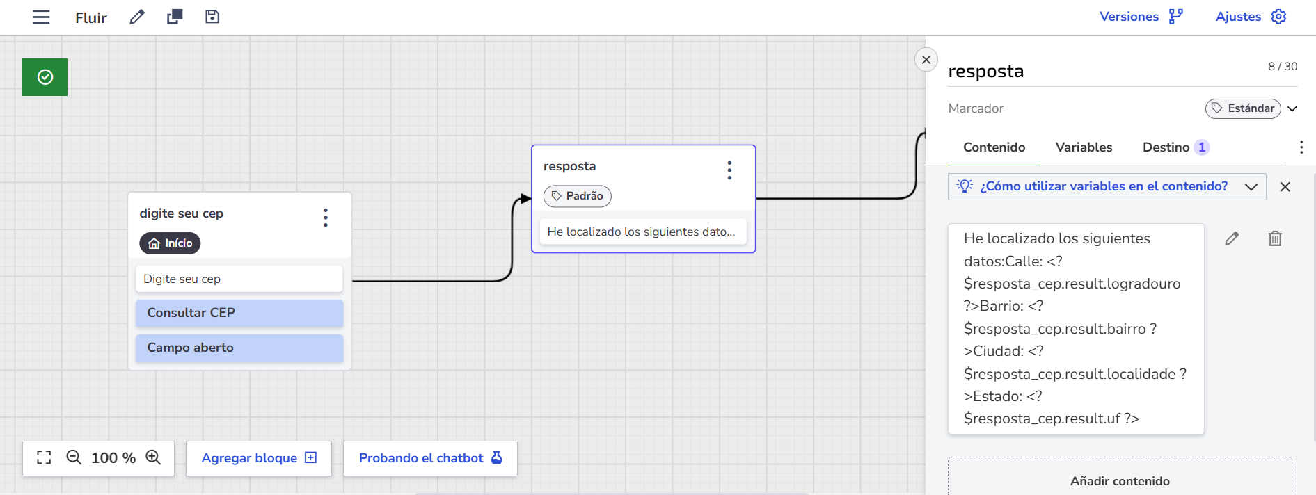 Para que el chatbot pueda recibir el CEP ingresado por el cliente, es necesario incluir en el mismo bloque un Campo abierto, que servirá para recolectar esta información antes de realizar la consulta.