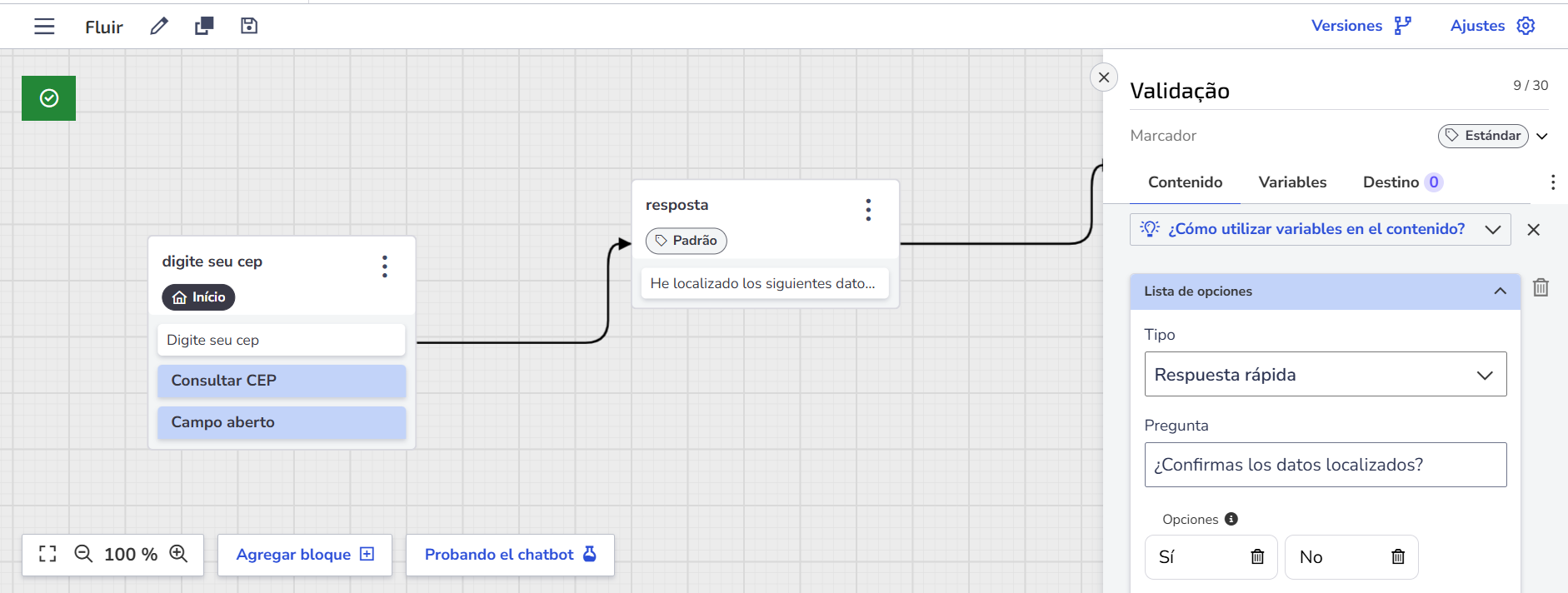 Para que el chatbot pueda recibir el CEP ingresado por el cliente, es necesario incluir en el mismo bloque un Campo abierto, que servirá para recolectar esta información antes de realizar la consulta.