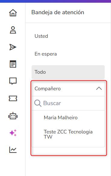 Cuando la bandeja compartida está desactivada, cada usuario visualiza solo sus propias atenciones y tareas, sin acceso a las conversaciones de los colegas en la sección Compañero.