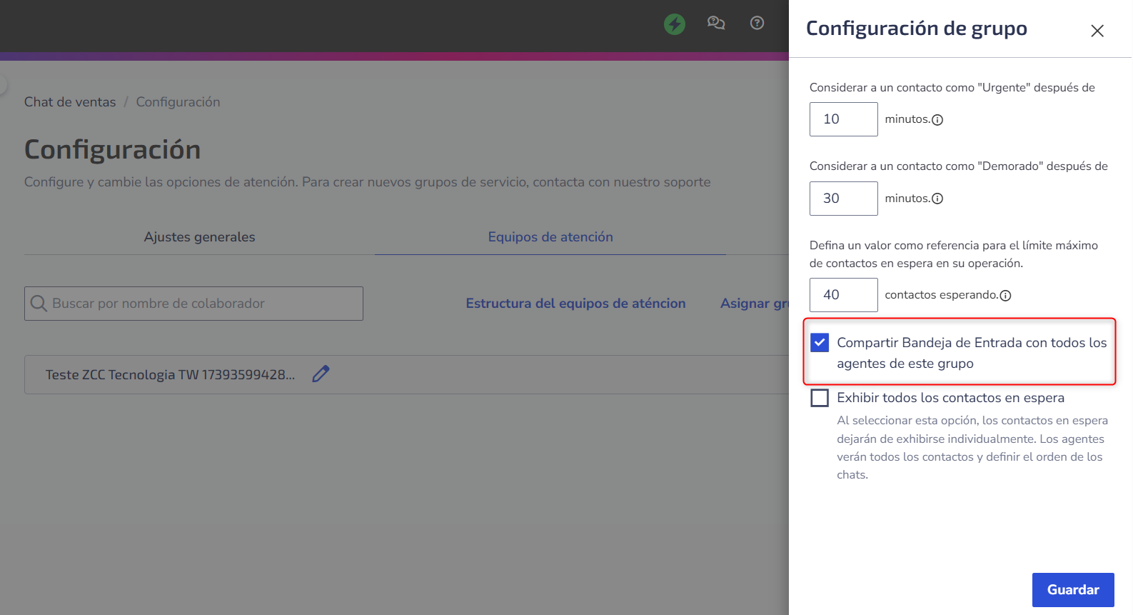 4. Habilita la opción Compartir Bandeja de Entrada con todos los agentes de este grupo.