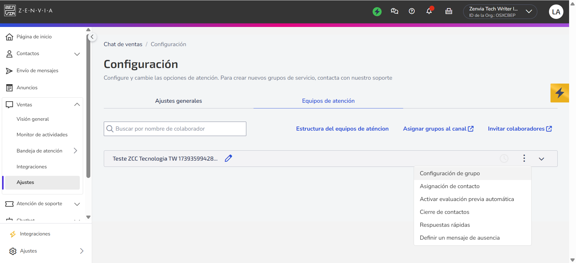 1. En el menú lateral, accede a Ventas > Ajustes > Equipos de atención.