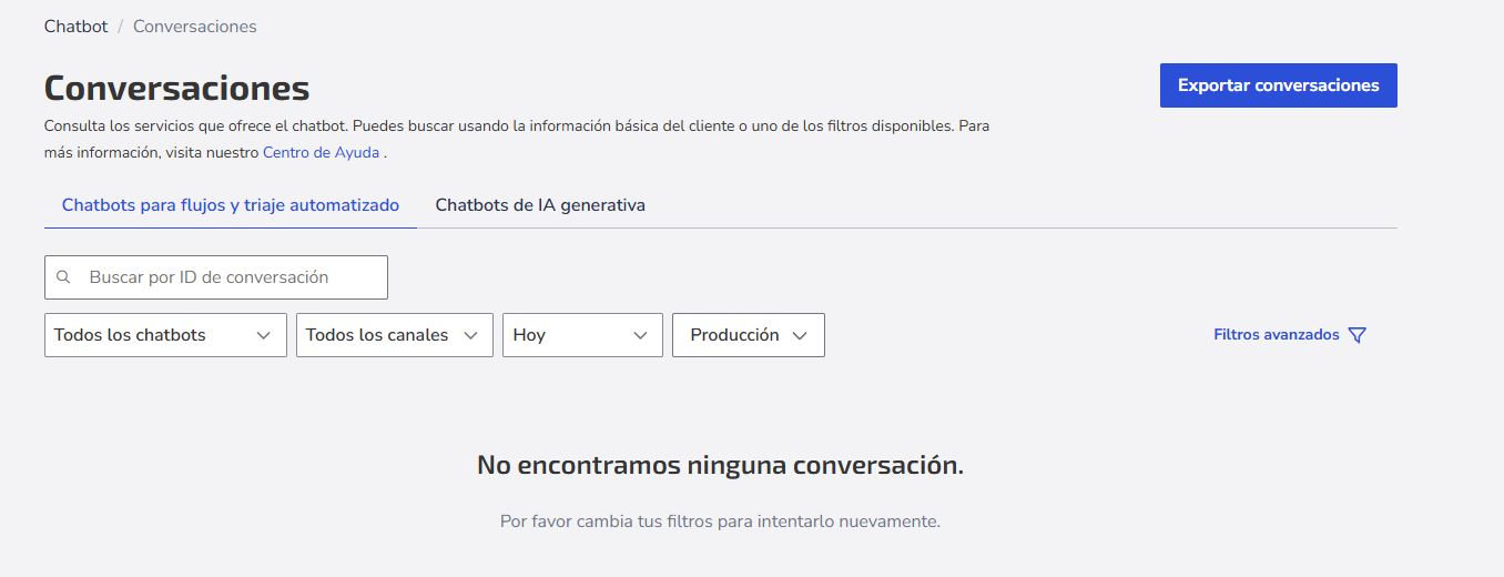 Ya sea para monitorear el rendimiento de un chatbot, revisar interacciones o exportar datos, la pantalla de Conversaciones es un recurso esencial para la gestión y el análisis del servicio automático.