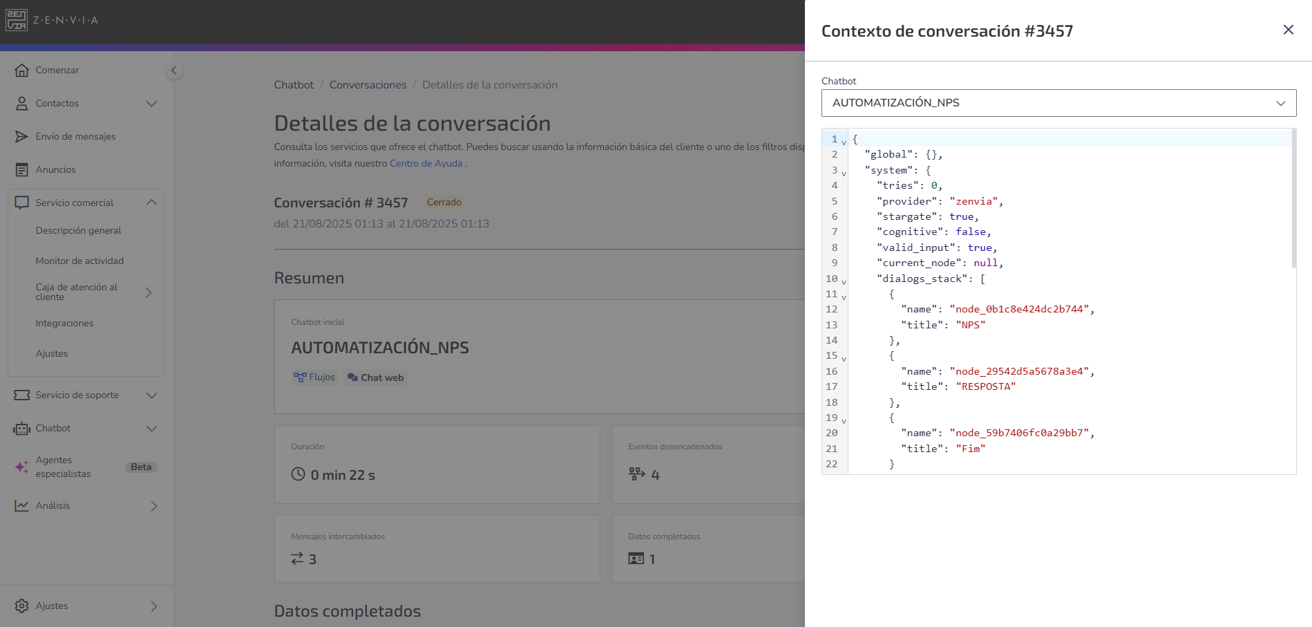 Ver contextos del chatbot: En esta opción, puedes seleccionar cualquier chatbot por el que pasó la conversación y ver todo el contexto relacionado, incluyendo variables e información registrada. Este recurso es útil cuando necesitas analizar lo que sucedió en el chatbot, por ejemplo, para verificar si una API recopiló los datos correctamente durante el flujo. Así, logras comprender el proceso de forma más clara y detallada.