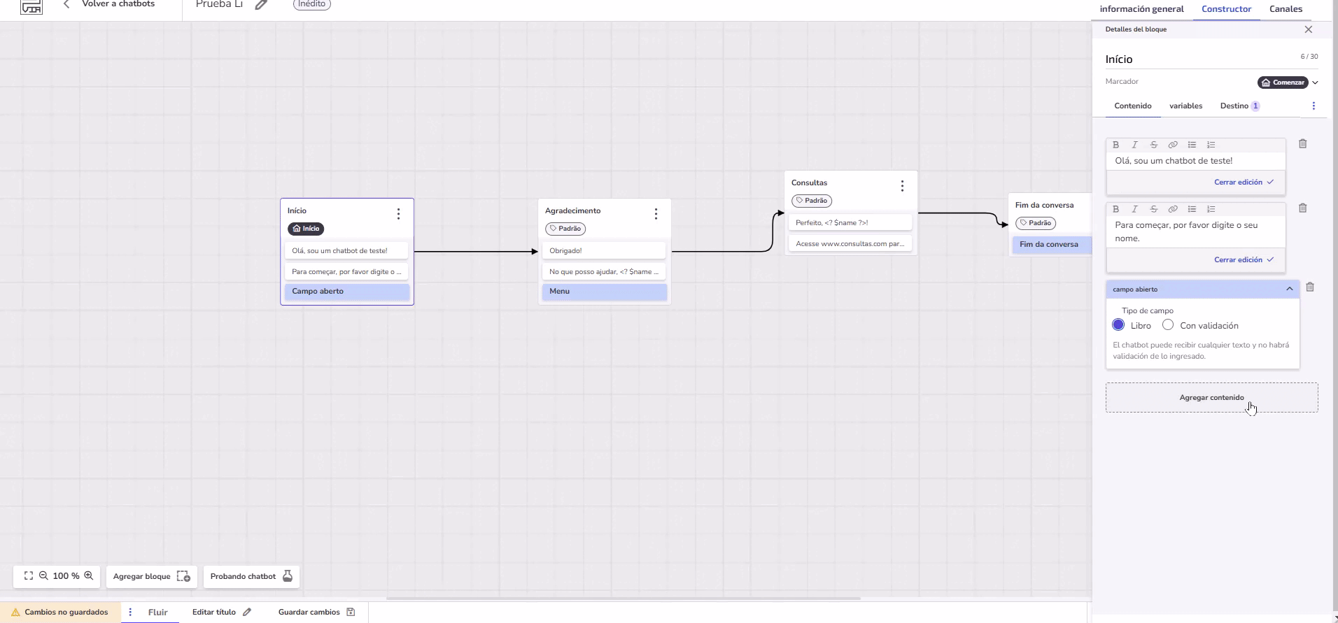 Finalmente, después de configurar todo, haz clic en Guardar cambios y luego en Probar Chatbot para ver cómo funciona el flujo en la práctica.