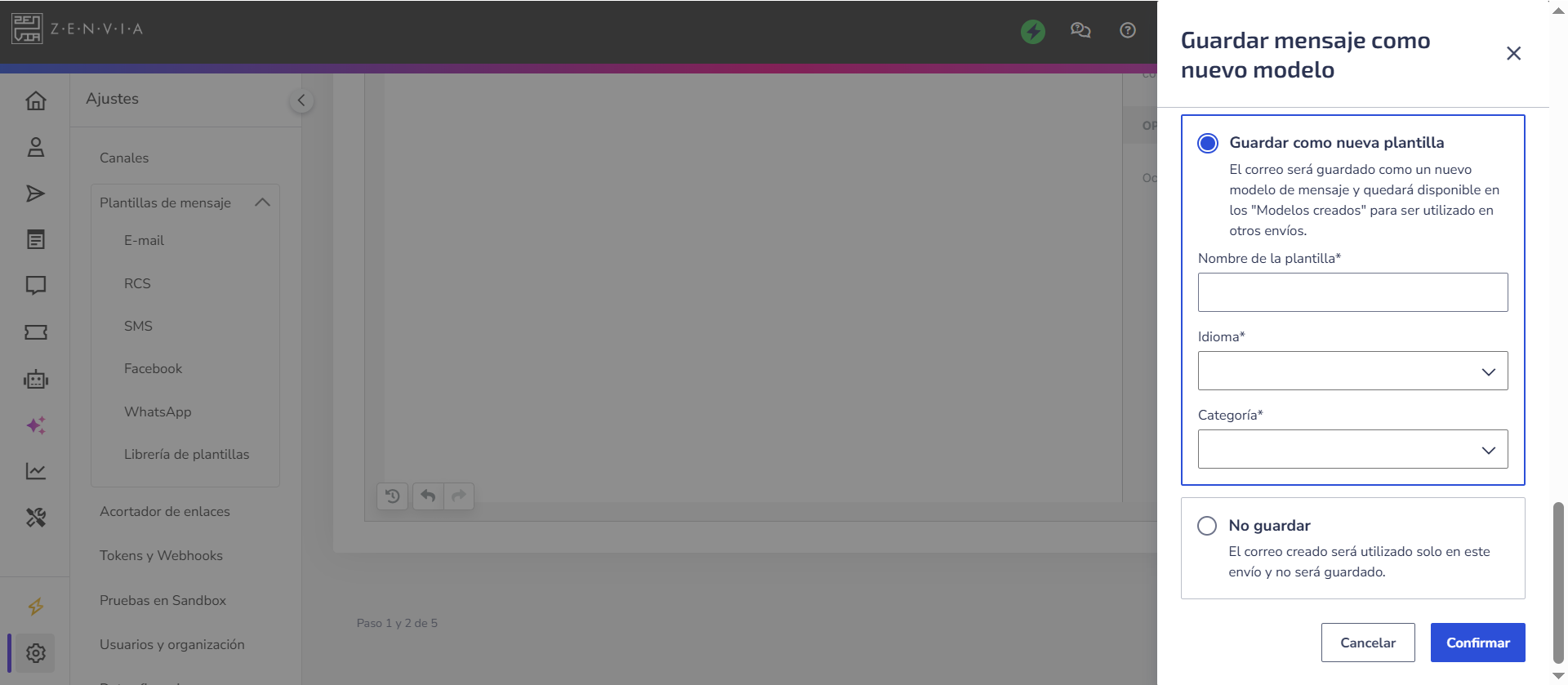 Si estás usando una plantilla existente, es posible actualizarla con los cambios, guardarla como una nueva plantilla (sin modificar la original) o continuar sin guardar, manteniendo las modificaciones solo para este envío.