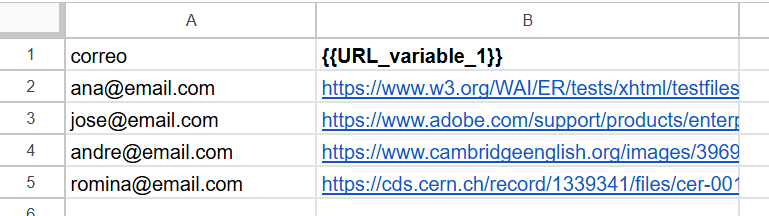 3. En la etapa de definición de destinatarios, envía un archivo CSV con la correspondencia entre el correo y el enlace del archivo adjunto de cada contacto.