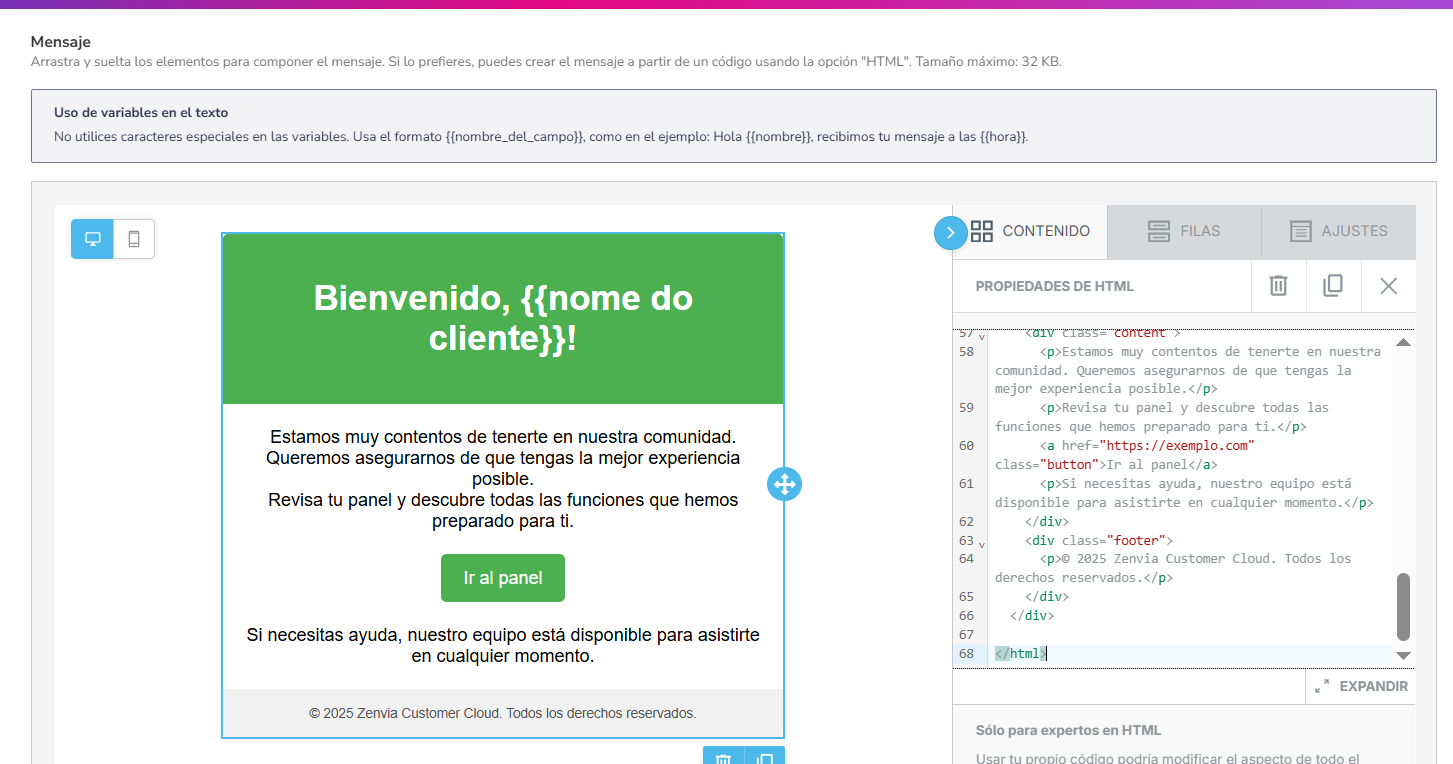 • Asunto, cuerpo del mensaje y archivos adjuntos pueden contener variables en el formato {{variable}}.