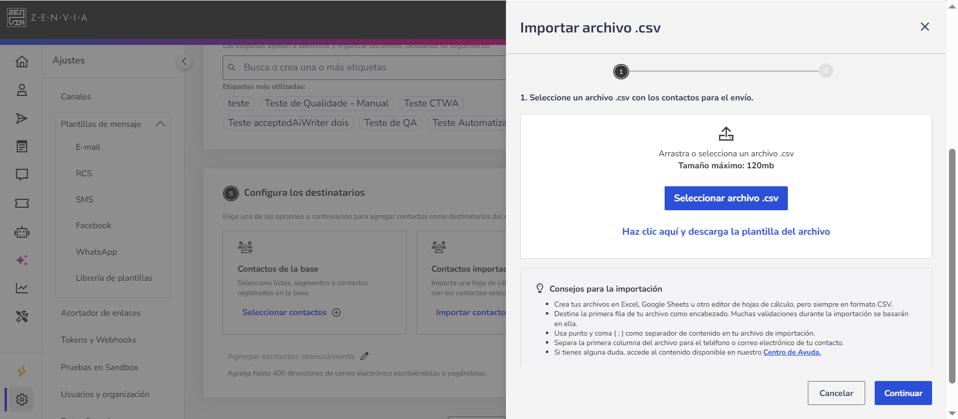 Define los destinatarios de los mensajes. Puedes enviar a contactos de tu base, importados desde un archivo .csv o agregados manualmente.