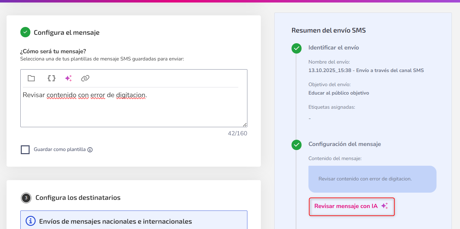 Además de brindar una experiencia positiva a los destinatarios, la herramienta de Inteligencia Artificial (IA) eleva la calidad de sus mensajes. La verificación de errores gramaticales y ortográficos asegura que los mensajes sean profesionales y estén libres de errores, lo que tiene un impacto positivo en su marca.