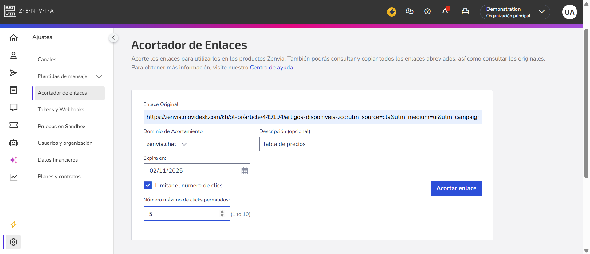 - Dominio acortador: Slecciona el dominio que se utilizará para generar los enlaces acortados. Actualmente, solo están disponibles los dominios proporcionados por Zenvia para su uso.