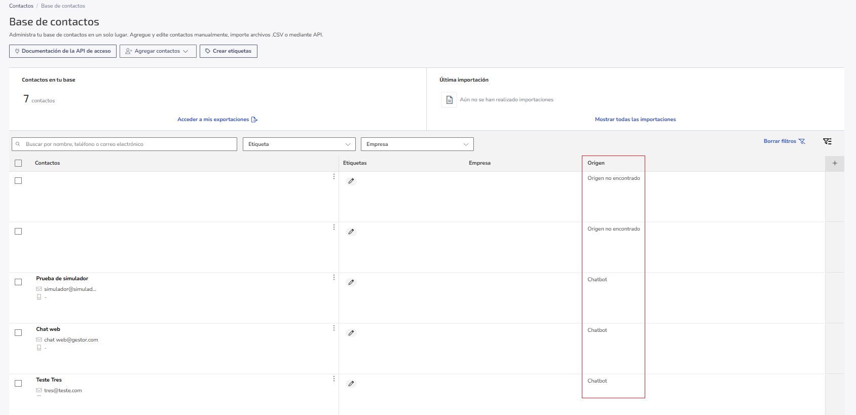 • Origen: Este filtro te permite identificar de dónde proviene cada contacto registrado en tu Base de contactos. El campo de origen se completa automáticamente según el canal o flujo utilizado. Por ejemplo, si el contacto fue creado a partir de una conversación con el Chatbot, el origen se registrará como "Chatbot".
