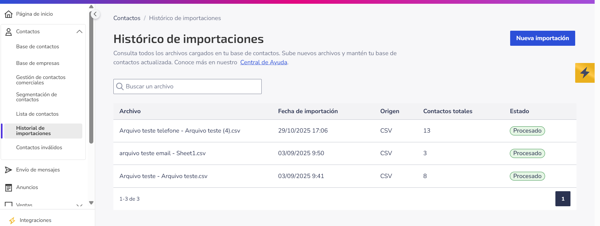 • Procesado: La importación fue concluida con éxito y los contactos ya están disponibles en las listas seleccionadas.