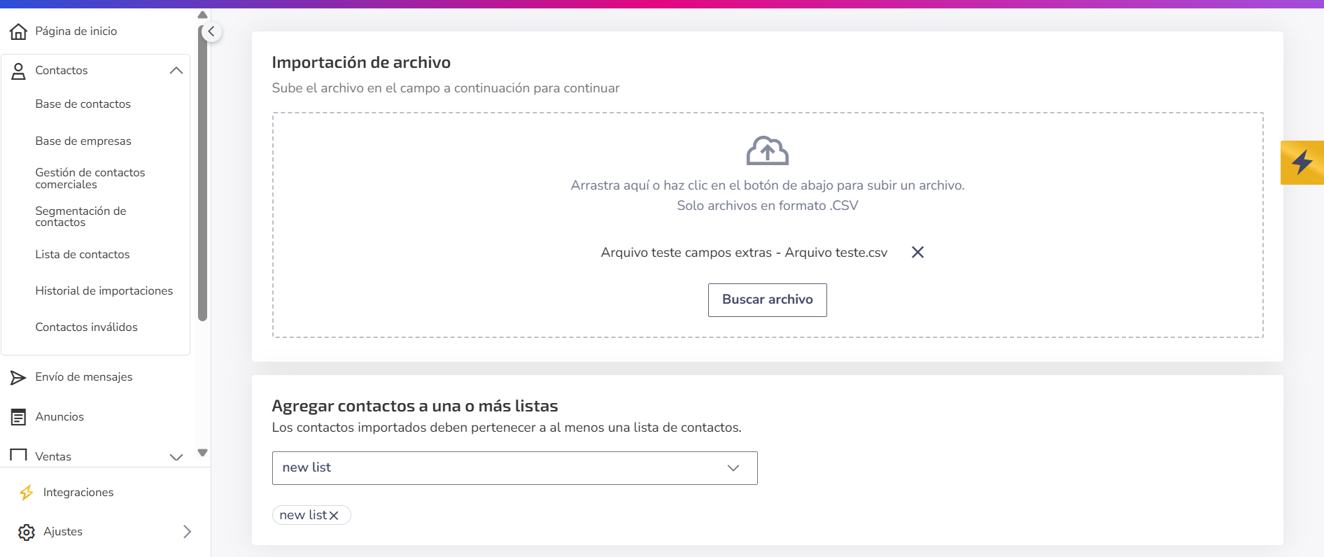 • Procesado: La importación fue concluida con éxito y los contactos ya están disponibles en las listas seleccionadas.