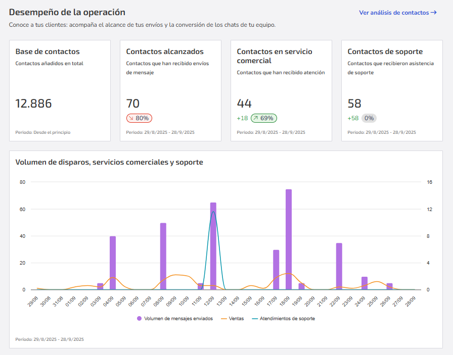 Estos datos combinan insights de uso interno (envíos masivos, atenciones comerciales y de soporte) y, cuando están disponibles, información de sistemas de gestión externos integrados.