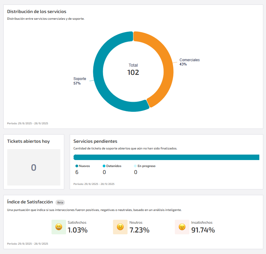 Contactos que fueron atendidos por el equipo de soporte en los últimos 30 días. También presenta una comparación con el período anterior, ayudando a monitorear el volumen y la eficiencia de las atenciones de soporte.