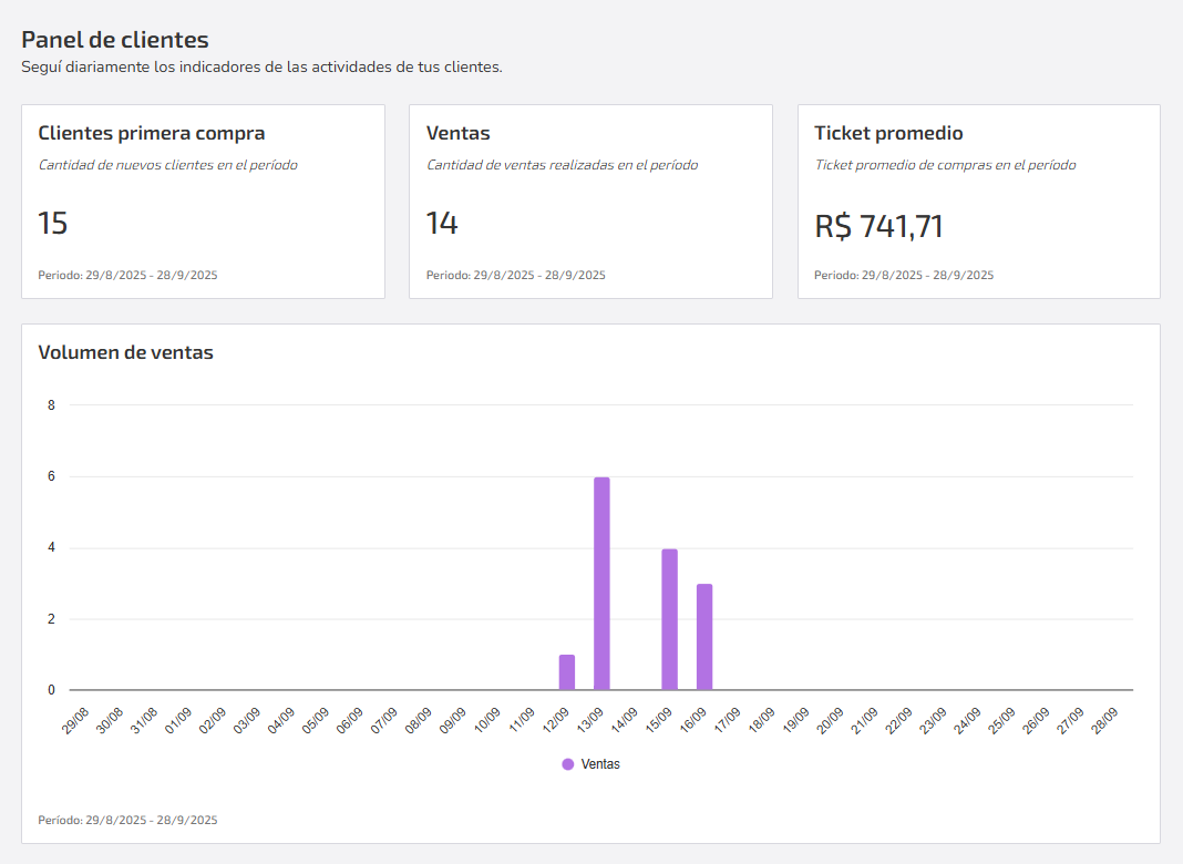 Muestra indicadores comerciales que ayudan a entender el comportamiento de compra y el desempeño de tus ventas. En resumen, es una vista consolidada de cuántos clientes nuevos conquistaste, cuánto vendiste, cuál fue el valor promedio de las compras y cómo evolucionaron esas ventas a lo largo del tiempo: