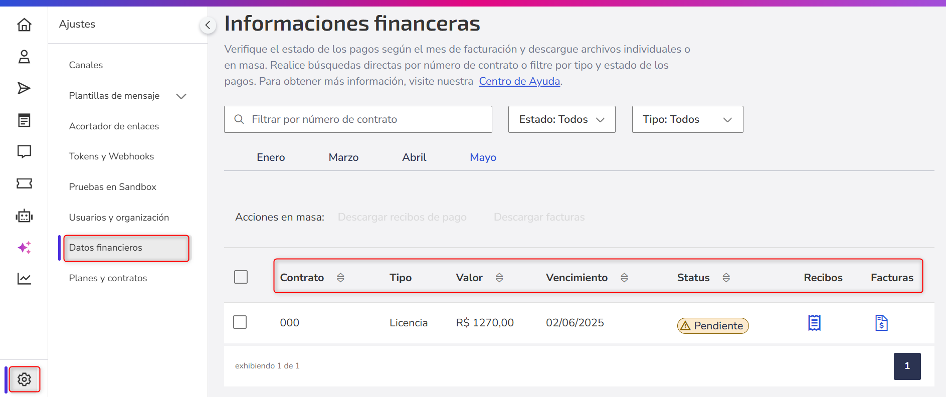 Consulta tu historial de pagos, el estado de invoices pagadas, pendientes y canceladas, y accede a los documentos fiscales directamente en Zenvia Customer Cloud desde el menú lateral Ajustes > Datos financieros.