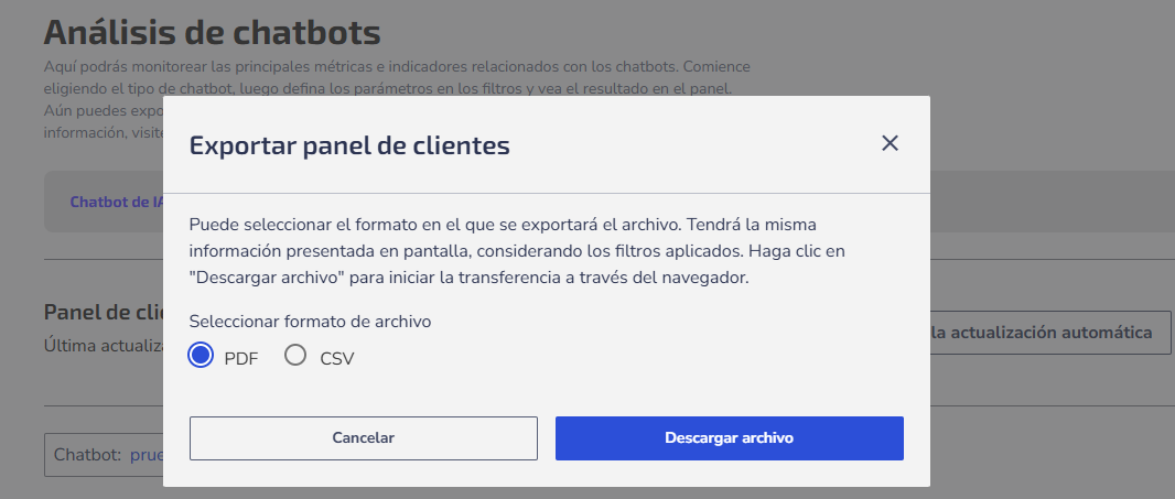 Además, es posible exportar los datos en formato PDF o CSV, seleccionando las métricas que desees. Por ejemplo, puedes supervisar cuántas personas interactuaron con el chatbot y cuántas fueron transferidas a un agente humano, obteniendo así información valiosa sobre el desempeño.