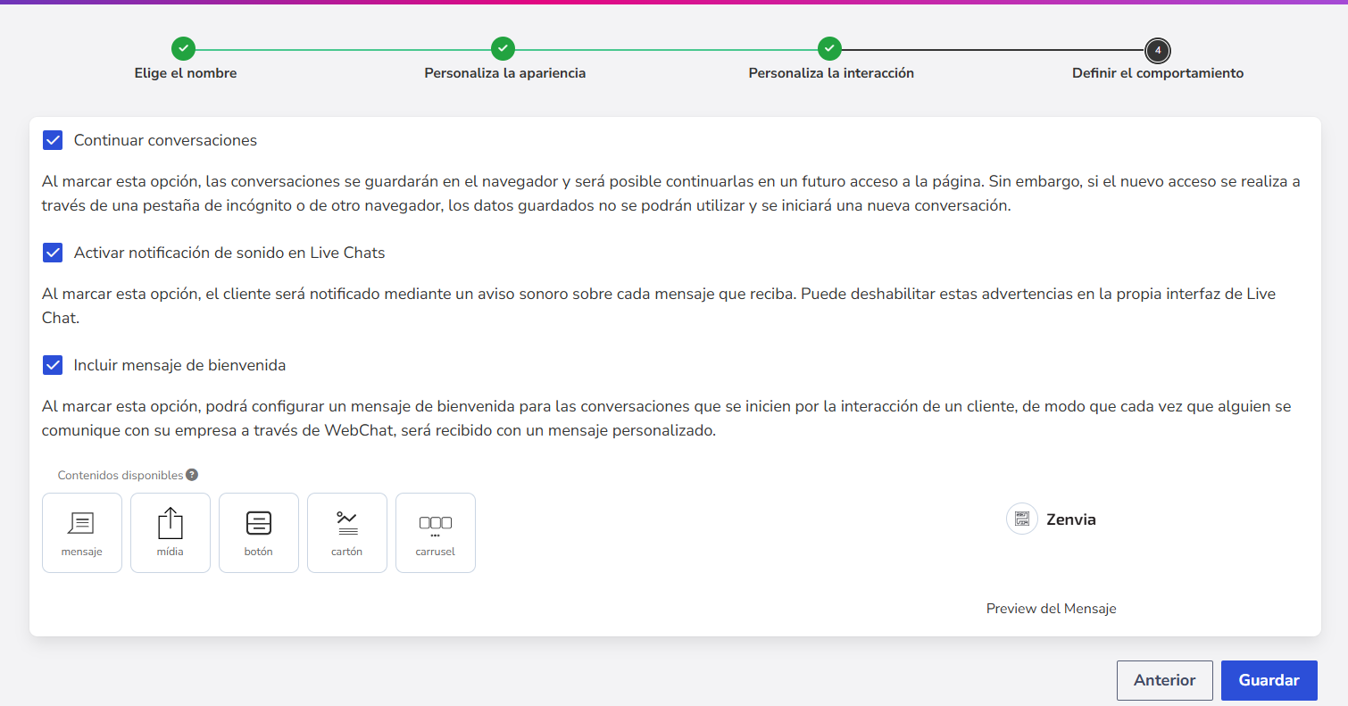 - ☑ Incluir mensaje de bienvenida:muestra un mensaje personalizado cuando el cliente inicia la conversación. Es posible usar: