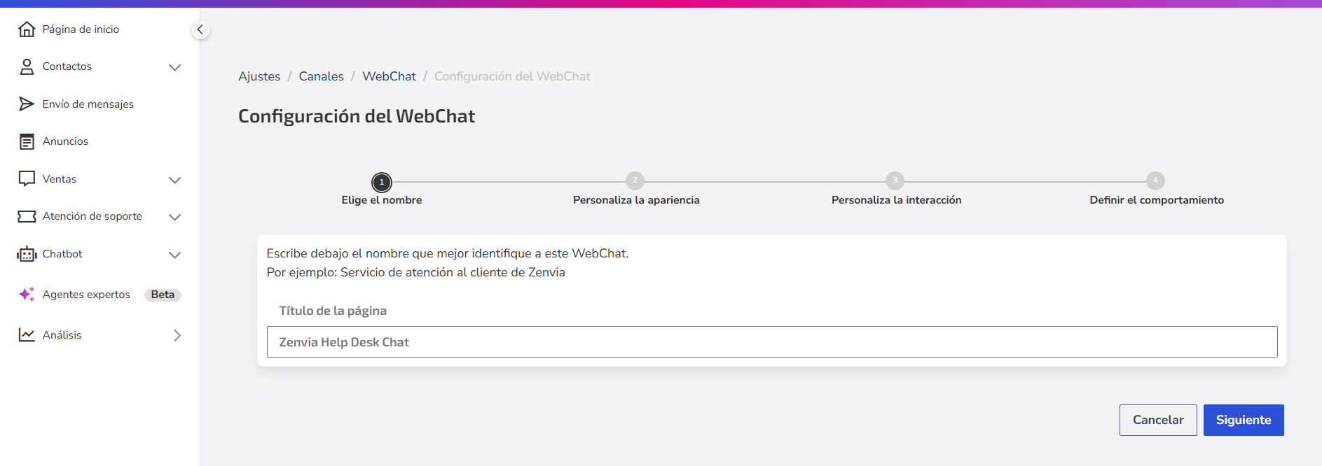 Ingresa un nombre de identificación para el WebChat. Será usado en la pantalla principal del canal para facilitar la gestión y organización de los diferentes WebChats creados.
