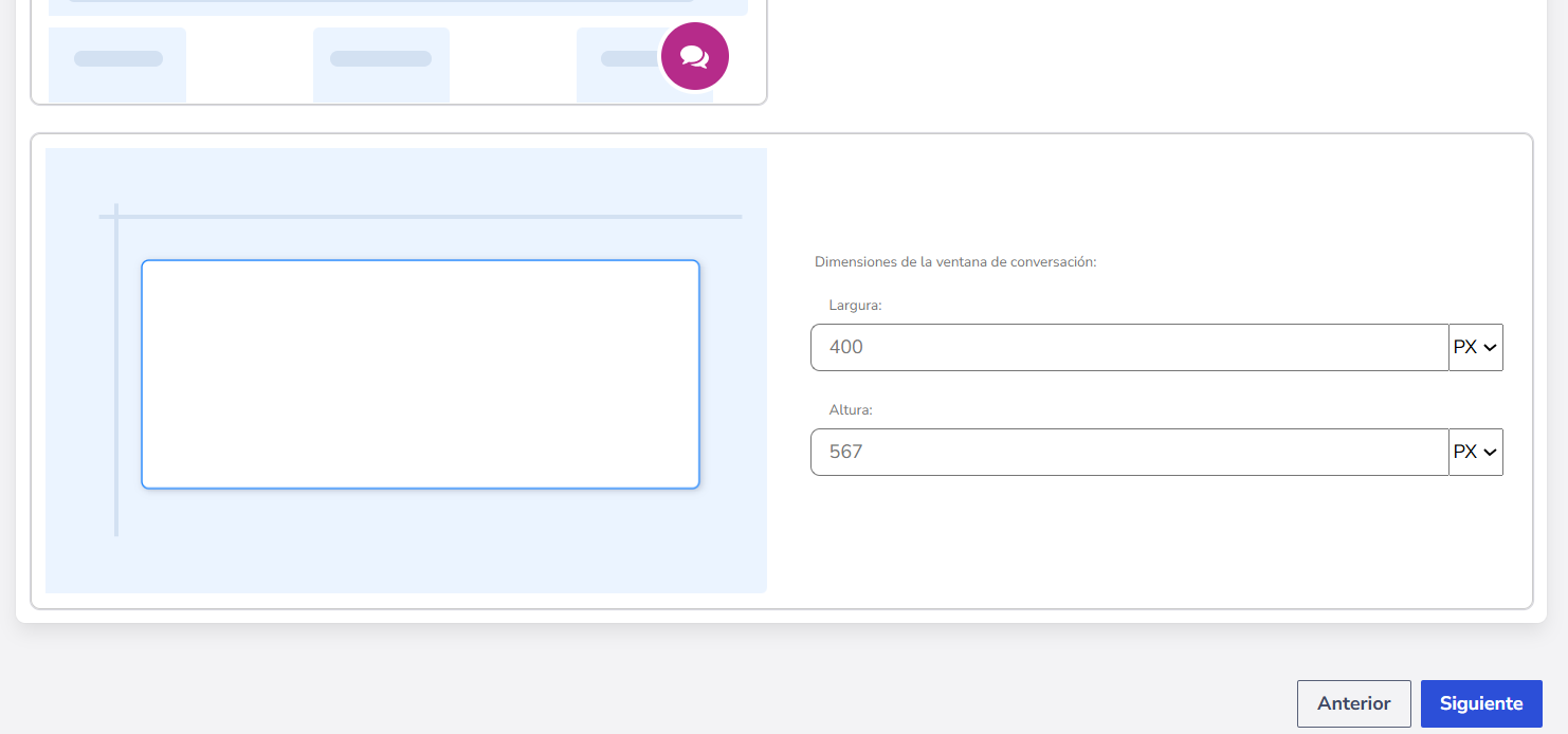 - Tamaño de la ventana de conversación (widget): el tamaño recomendado es 400px de ancho por 567px de alto, garantizando buena usabilidad en diferentes dispositivos.