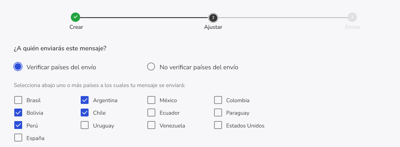 Si decides no validar los países, existe el riesgo de que el mensaje se envíe a destinatarios en regiones incorrectas. Para evitar problemas, recomendamos siempre revisar esta configuración antes de completar el envío.