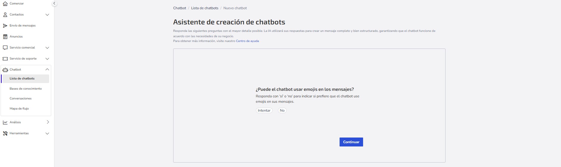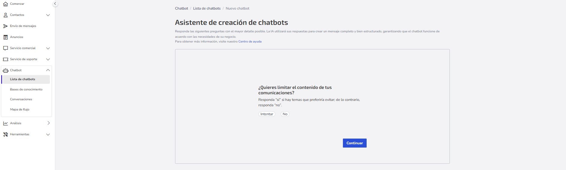 El Asistente de creación de chatbot es una herramienta que simplifica la creación de chatbots, haciendo el proceso más rápido e intuitivo.