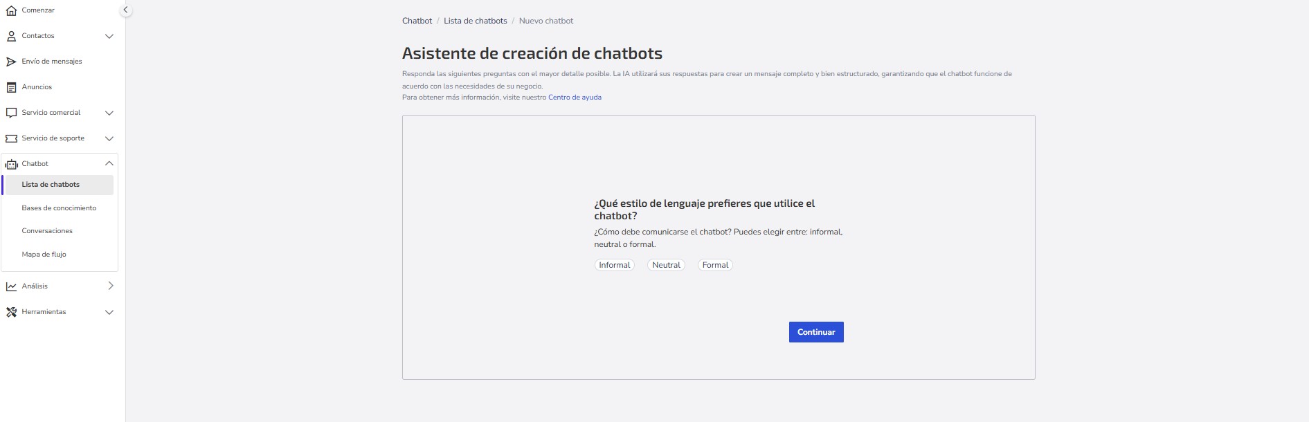 2- Define qué estilo de lenguaje prefieres que use el chatbot. Aquí eliges cómo debe comunicarse el chatbot, pudiendo escoger entre: informal, neutro o formal.