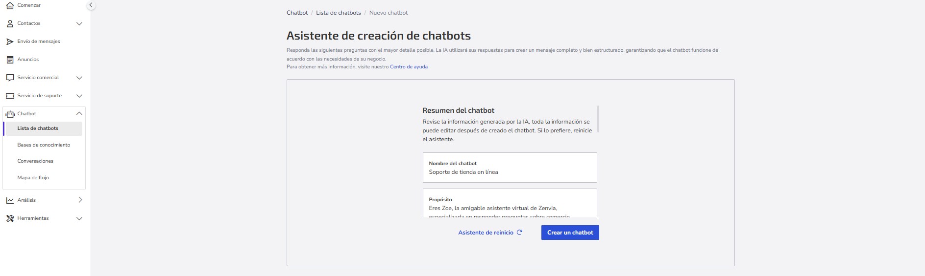 13- Por último, revisa la información generada por la IA. Toda la información podrá ser editada después de la creación del chatbot. Si lo prefieres, reinicia el asistente. Si todo está correcto, finaliza en Crear chatbot.