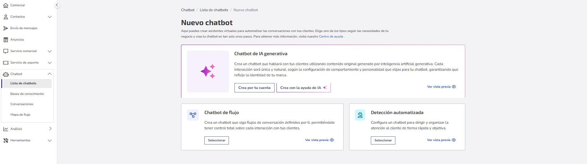 • Creación manual: Permite configurar cada detalle de tu chatbot.