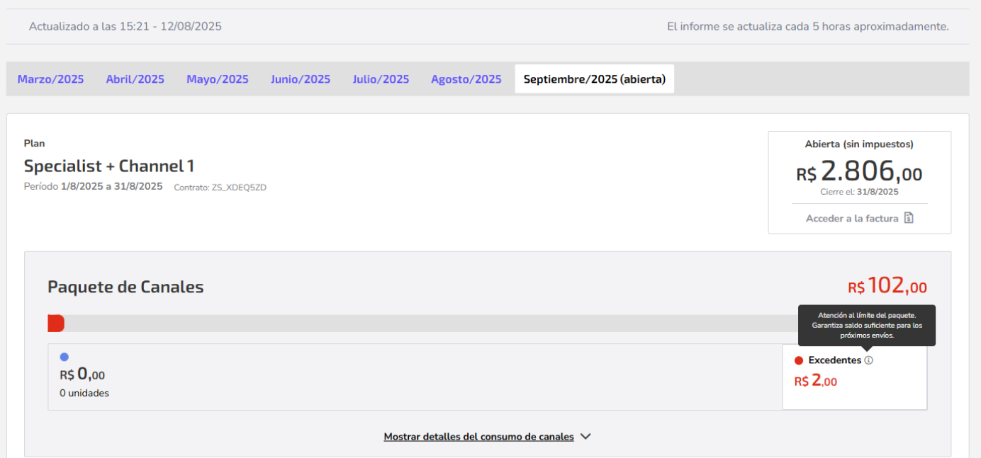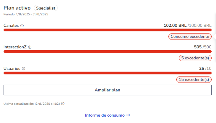 • Monitorea regularmente tu plan en la página inicial, card Plan Activo (ve el ejemplo arriba) o en Análisis > Consumo para ver detalles por canal.