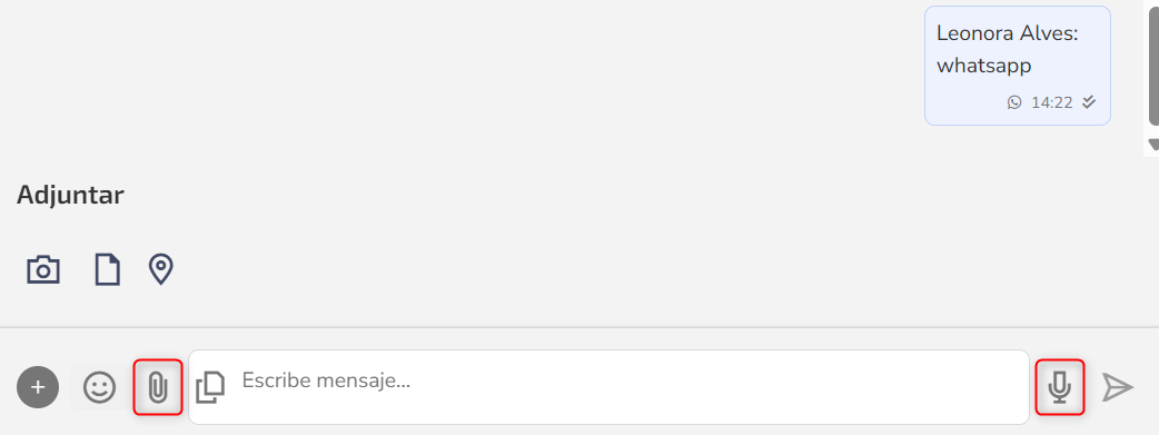 Usted puede enviar imágenes, videos, documentos, ubicación y audios directamente en el chat con el contacto.
